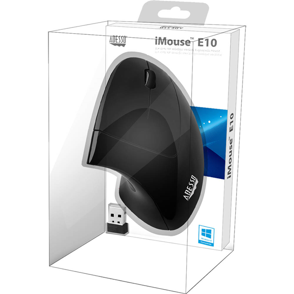 With 2.4 GHz Radio Frequency technology, the Adesso iMouse E10 Wireless Vertical Ergonomic Mouse provides you with wireless convenience and the freedom of a smooth connection for up to a 30-foot range without tangled cables