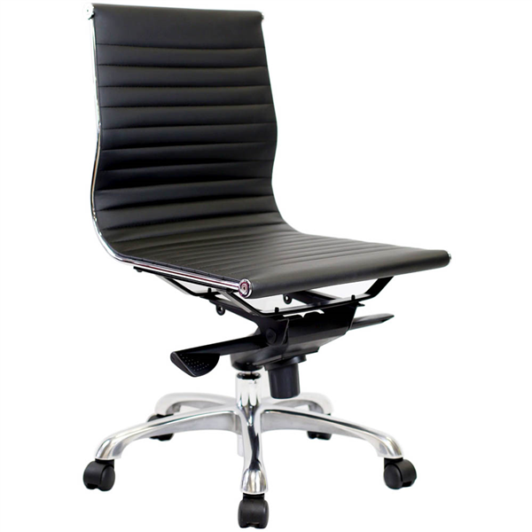Fully upholstered in easy to clean PU back and seat with multi lock tilt mech and tension control 5 star base with easy glide castors Central tilting mechanism Tilting tension adjustable and lockable Gas lift for seat height adjustment Reinforced nylon casters 3 year warranty Some assembly required Aluminium base, Chrome frame