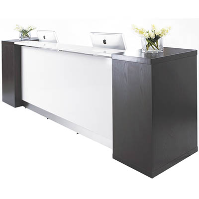 ASTON RECEPTION COUNTER WITH SIDE BOOKSHELVES 3100 X 810 X 1150MM WHITE/DARK CHOCOLATE BROWN