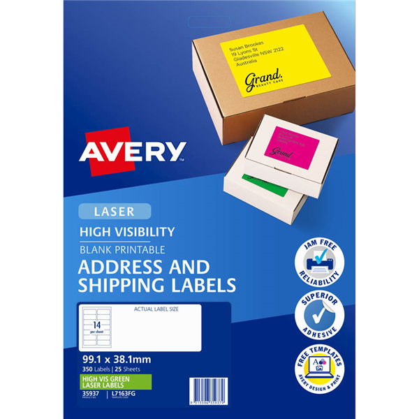 AVERY 35937 L7163FG HIGH VISIBILITY SHIPPING LABEL LASER 14UP FLUORO GREEN PACK 25