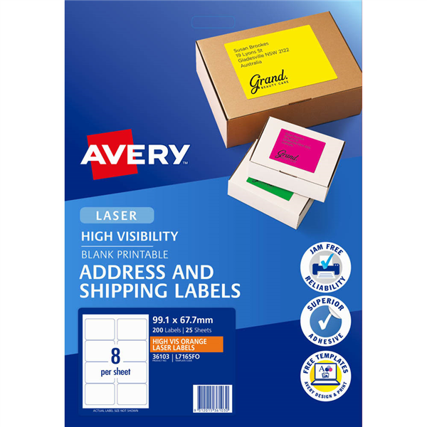 AVERY 36103 L7165FO HIGH VISIBILITY SHIPPING LABEL LASER 8UP FLUORO ORANGE BOX 25