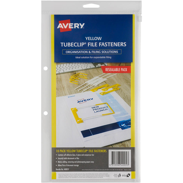 Avery Tubeclip 3 piece set is versatile and really is a great solution to save space You don't even need to switch your filing system to enjoy this wonderful solution as Avery Tubeclip can be used with either manilla files or shelf lateral files The Avery Tubeclip expands as the file fills in order to reduce wasted space Tubeclip 3 piece set comes with self adhesive base, a plastic U piece and a plastic coloured compressor bar Suitable for securing documents that require easy access and frequent use Allows pages to be added or removed at any position within the file Available in yellow, red and blue colour to suit your preferences Designed to eliminate wasted space as Tubeclip expands as your file fills