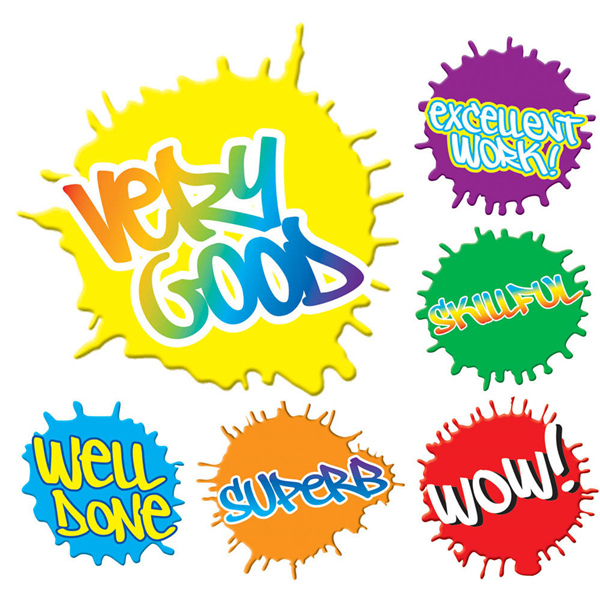 Fun words on paint splat designs kids will feel proud to receive Packs of 96 colourful glossy stickers in six design options Bright rewards for bright little minds! Pack of 6 mixed designs Perfect for teachers rewarding school children Great for parents rewarding good behaviour at home Bright, colourful designs that kids will aspire to collect