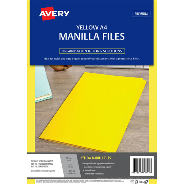 An Avery Manilla File is a simple filing solution to help you get organised There is also a range of different colours to choose from so filing is no longer boring! Avery manilla files offer the highest quality from a strong and durable manilla board Ideal for projects or personal files and suitable for compact archiving into storage systems Small pack ideal for home or small office use Available in a range of other colours and foolscap and A4 sizes