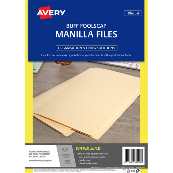 An Avery Manilla File is a simple filing solution to help you get organised Mix and match with different colours so filing is no longer boring! Avery Manilla Files offer the highest quality from a strong and durable manilla board Available in buff, range of other colours and foolscap, A4 sizes
