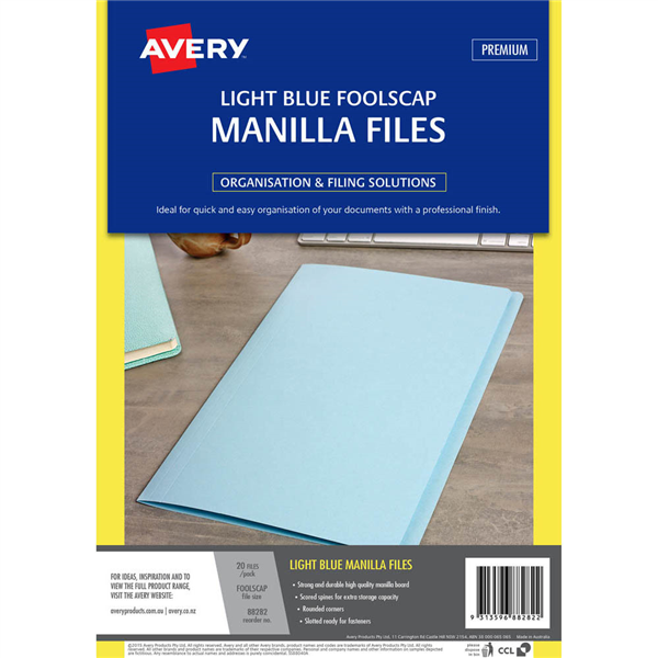 Avery manilla file is a simple filing solution to help you get organised There is also a range of different colours to choose from so filing is no longer boring! Avery manilla files offer the highest quality from a strong and durable manilla board Ideal for projects or personal files and suitable for compact archiving into storage systems Available in buff, range of other colours and foolscap, A4 sizes