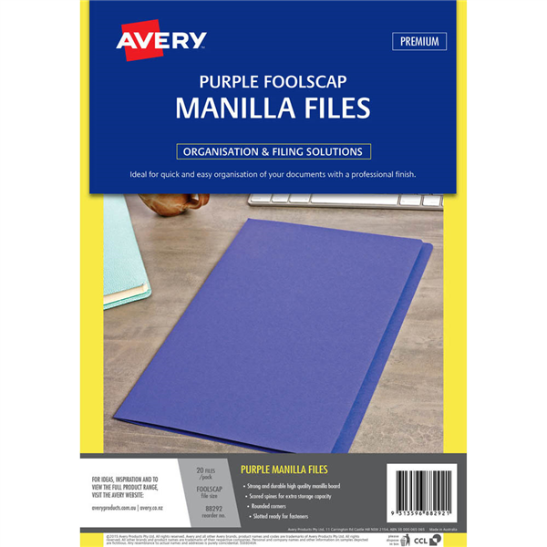 AVERY 88292 MANILLA FOLDER FOOLSCAP PURPLE PACK 20