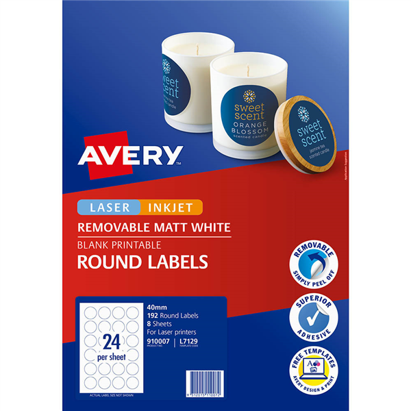 AVERY 910007 L7129 REMOVEABLE BLANK PRINTABLE LABELS ROUND LASER/INKJET 24UP MATTE WHITE PACK 192