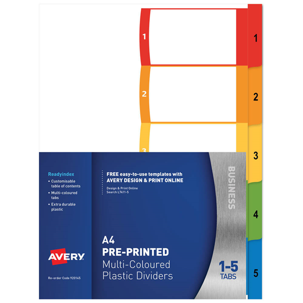 These polypropylene ReadyIndex dividers help you stay organised so you can locate important documents quickly and easily They feature 5 pre-printed, numbered multi-colour tabs as well as a table of contents page you can customise using the free software and templates at www.averyproducts.com.au Once the design is done, simply print it on your laser or inkjet printer Now that's a road map to success Easy design and printing: use Avery templates in Microsoft Word or try Avery software at www.averyproducts.com.au Fast and easy way to create professional indexes Laser or inkjet compatible Ideal when presentation is important