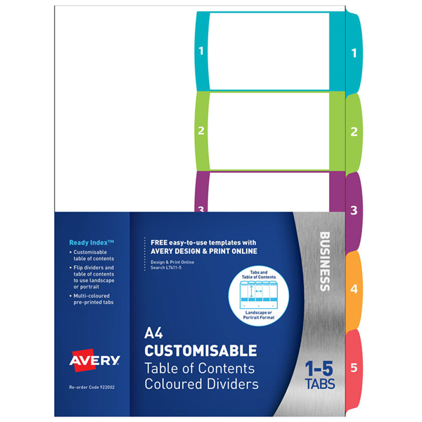 Pre-printed, numbered coloured tabs from 1 to 5 allow for instant indexing The extra strong reinforced punched holes and laminated tabs keep your dividers looking good for longer and can be reused time and time again The Table of Contents and Dividers and Tabs can be used either in Landscape or Portrait orientation It's easy to customise your table of contents page with our FREE software, Avery Design and Print online Select from the various templates that best suit your project, enter section titles directly on your computer and print from your laser or inkjet printer These multi-punched dividers are made from white manilla with reinforced coloured pre-printed tabs in 1-5 numeric sections For clear identification, the Table of Contents sheet is colour coded to match the tabs Simply flip the dividers and table of contents to use in landscape or portrait format depending upon your preference Laser or inkjet compatible Customise your table of contents with our free and easy-to-use template software; Avery Design and Print - available at averyproducts.com.au/print Ideal when presentation is important Strong plastic tab reinforcement