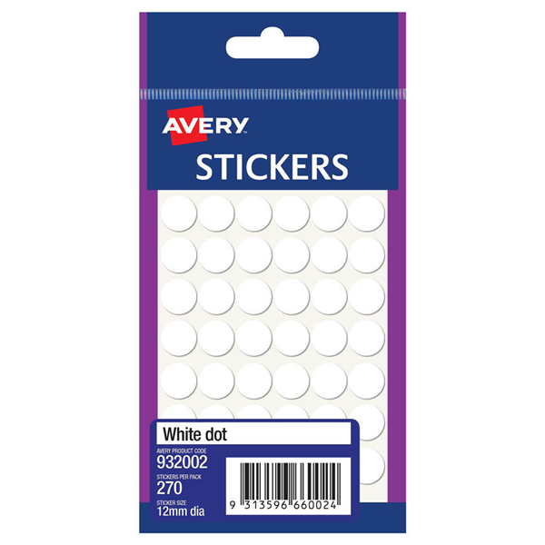 AVERY 932002 MULTI-PURPOSE STICKERS CIRCLE 12MM WHITE PACK 270