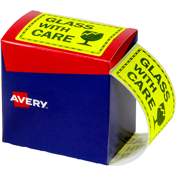 AVERY 932618 MESSAGE LABEL GLASS WITH CARE 75 X 99.6MM FLUORO YELLOW PACK 750