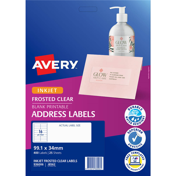 They provide a modern, frosted matt finish to your mail You can create custom labels using free Avery software and templates at averyproducts.com.au Labels provide a contemporary matt frosted finish Ideal for dark coloured or patterned envelopes, wedding invitations and corporate events Features Quick Peel Pop-up Edge technology: bend back the sheet and the label edge pops-up Compatible with inkjet printers and Smudge Free guaranteed Supported by free Avery software and templates available at averyproducts.com.au/print