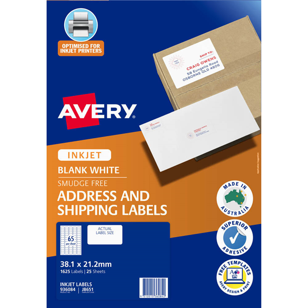 These labels are available in a perfect pack size for home or small business use Inkjet label material is optimised for a smudge free professional finish Superior strong adhesive Customise your labels with our free and easy-to-use template software; Avery Design and Print - available at averyproducts.com.au/print Labels made with paper from sourced from sustainable forests