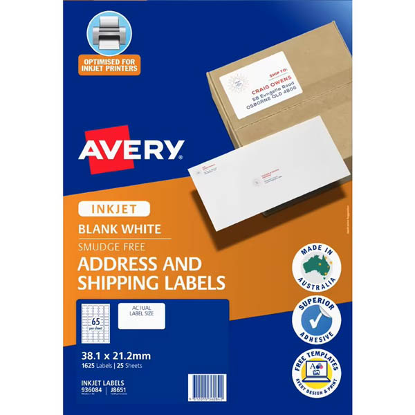 Avery address labels offer the Sure Feed feature which delivers a more reliable feed through your printer by preventing jams and misalignments These labels also come with a special Smudge Free promise, ensuring smooth print results with your inkjet printer so you can confidently apply the label straight onto your envelopes without any smudge marks Whether you're printing in black and white or adding colour, these bright white addressing labels dry instantly after printing with sharp text and colours for professional looking labels every time These labels feature Quick Peel which allows for quicker detachment of the label from the backing sheet Avery Certified labels are made with paper sourced from well-managed forests so you can be certain you are helping the environment Customise your labels with our free and easy-to-use template software; Avery Design and Print - available at averyproducts.com.au/print The packaging and labels can also be recycled Labels made with paper from sourced from sustainable forests