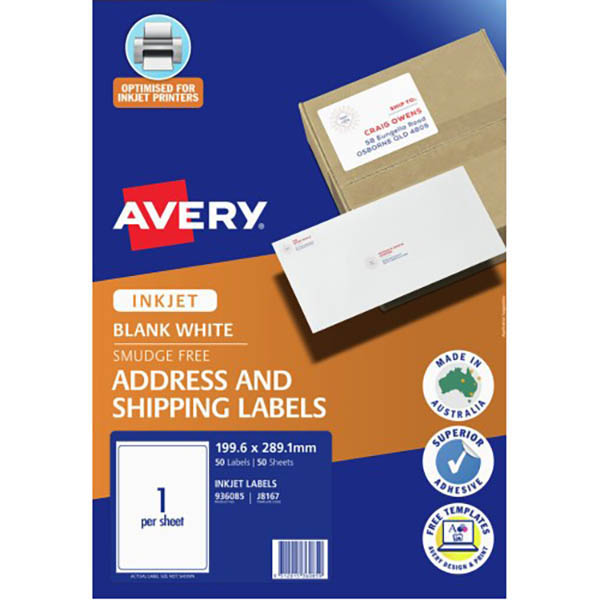 Avery shipping labels are great for addressing your parcels, boxes, large envelopes and mailing tubes The superior adhesive is designed to stay securely and permanently on your packages Avery inkjet shipping labels are tried and tested and make the professional handling of large and small dispatches so easy Made from certified paper from well-managed forests, not only are they environmentally friendly, but with the premium adhesive, the labels stay securely and permanently on your packages ensuring they arrive at the correct destination. perfect for the home or small office with an Inkjet printer Optimised for inkjet printers Ideal for parcels, packages, boxes, mailing tubes, large envelopes and gifts Jam-Free reliability helps to minimise waste for hassle free printing Customise your labels with our free and easy-to-use template software; Avery Design and Print - available at averyproducts.com.au/print Labels made with paper from sourced from sustainable forests