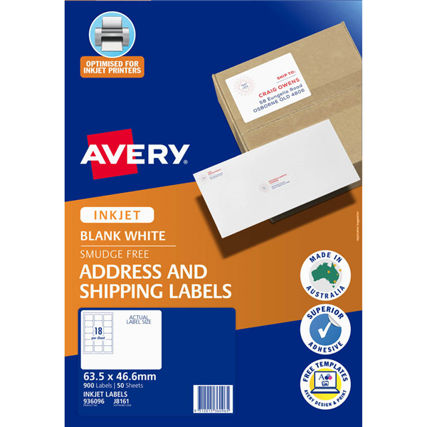 Inkjet label material is optimised for a smudge free professional finish Superior strong adhesive Customise your labels with our free and easy-to-use template software; Avery Design and Print - available at averyproducts.com.au/print Labels made with paper from sourced from sustainable forests