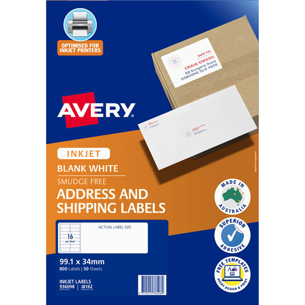 Inkjet label material is optimised for a smudge free professional finish Superior strong adhesive Customise your labels with our free and easy-to-use template software; Avery Design and Print - available at averyproducts.com.au/print Labels made with paper from sourced from sustainable forests