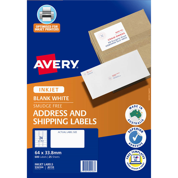 Inkjet label material is optimised for a smudge free professional finish Superior strong adhesive Customise your labels with our free and easy-to-use template software; Avery Design and Print - available at averyproducts.com.au/print Labels made with paper from sourced from sustainable forests