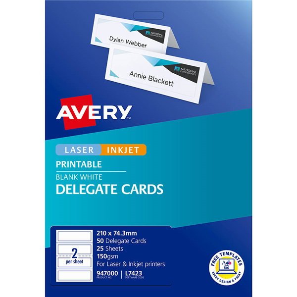 AVERY 947000 L7423 DELEGATE CARDS LASER EMBOSSED 2UP 210 X 74.25MM 150GSM PACK 25