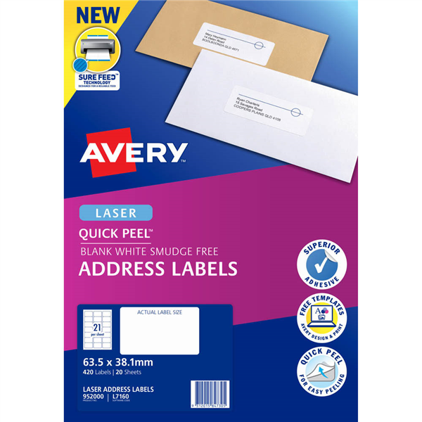 Quick Peel technology allows for quicker and easier detachment of labels from backing sheet Customise your labels with our free and easy-to-use template software; Avery Design and Print - available at averyproducts.com.au/print Special adhesive withstands the high heat of laser printers Labels made with paper from sourced from sustainable forests