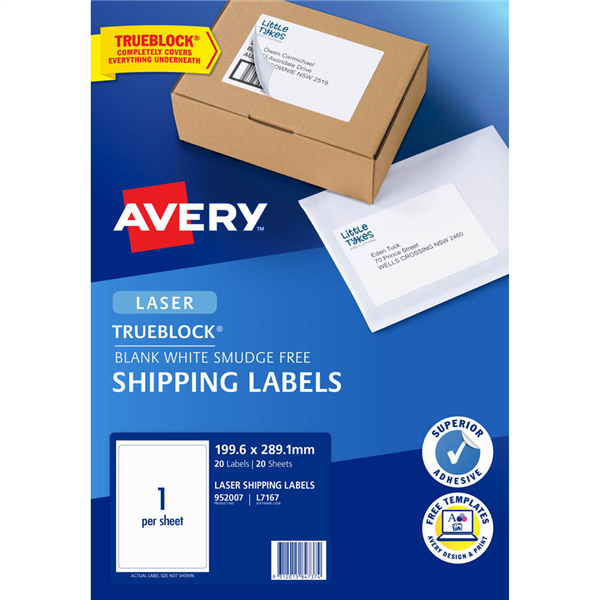 AVERY 952007 L7167 TRUEBLOCK SHIPPING LABEL LASER 1UP WHITE PACK 20