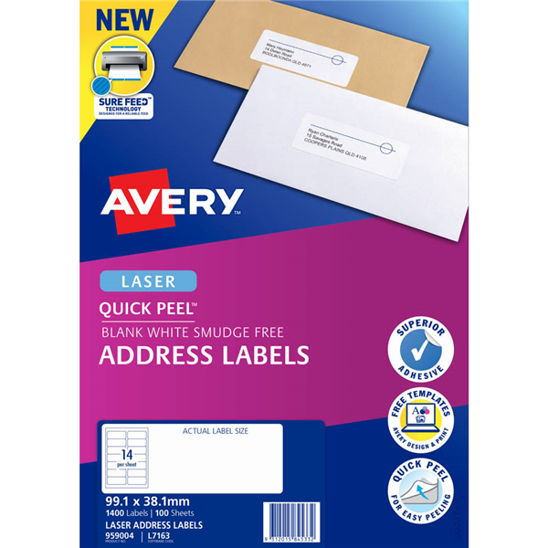 Quick Peel technology allows for quicker and easier detachment of labels from backing sheet Customise your labels with our free and easy-to-use template software; Avery Design and Print - available at averyproducts.com.au/print Special adhesive withstands the high heat of laser printers Labels made with paper from sourced from sustainable forests