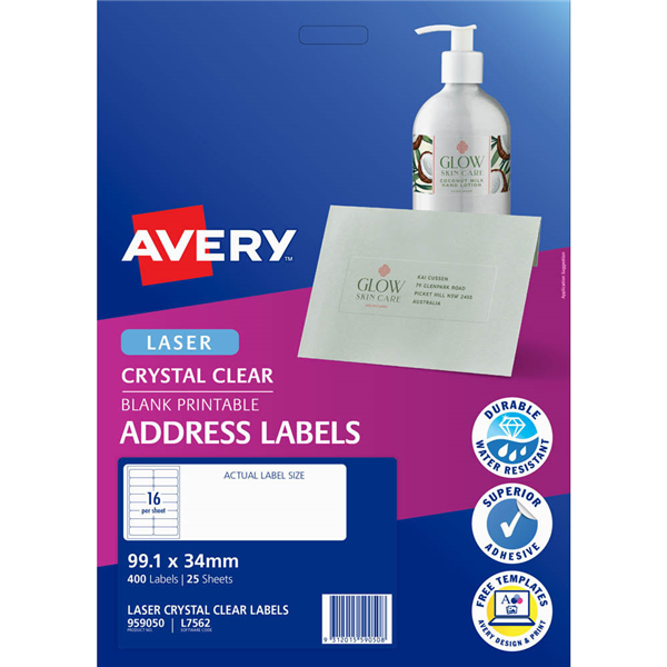 They are 100% transparent glossy labels, and are incredibly durable (oil, dirt, splash and tear proof) These labels are ideal for addressing on wedding invitations, coloured envelopes and corporate events You can create custom labels using free Avery software and templates at averyproducts.com.au Made from clear, glossy material and are 100% transparent Ideal for coloured envelopes, wedding invitations and corporate events Made from durable material, which is oil, dirt, splash and tear proof Developed for laser printers and guaranteed Jam Free Customise your labels with free Avery software and templates available at averyproducts.com.au/print