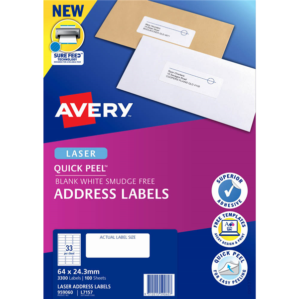 Quick Peel technology allows for quicker and easier detachment of labels from backing sheet Customise your labels with our free and easy-to-use template software; Avery Design and Print - available at averyproducts.com.au/print Special adhesive withstands the high heat of laser printers Labels made with paper from sourced from sustainable forests