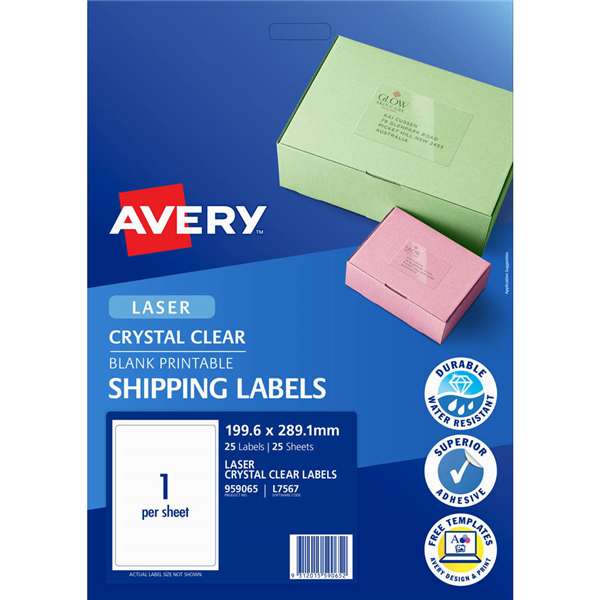 They are durable (oil, dirt, splash and tear proof), and 100% transparent, so your parcel or gift looks clean and professional The labels can also be used on glass polished surfaces, plastic or metal surfaces Made from clear, glossy material and are 100% transparent Ideal for elegant parcels, gifts and boxes Made from durable material, which is oil, dirt, splash and tear proof Developed for laser printers and guaranteed Jam Free Customise your labels with free Avery software and templates available at averyproducts.com.au/print