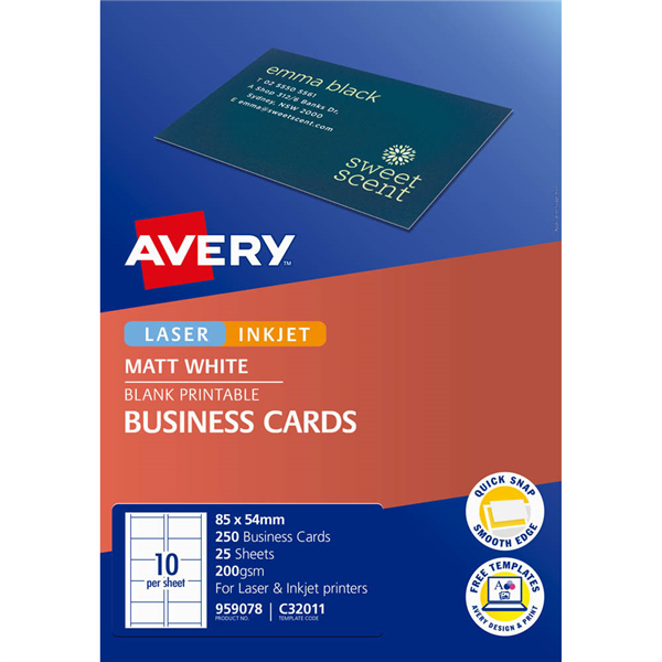 With the bright white, 200gsm card, you can expect nothing less than elegant looking cards printed on your inkjet or laser printer instantly No need to wait for printer lead times, print just as many as you need when you need them Single-sided printable matt white card in a size of 85 x 54mm with 10 cards per sheet in a bulk pack of 25 sheets, perfect for frequent users who need a lot of business cards or for those creating cards for different people in the office Use the Avery Design & Print online to create your business cards. you can find a selection of images and designs ready to use or import your logo and text to create your own and print them on your inkjet or laser printer in minutes. It's never been easier Also great for creating loyalty cards, gift tags, appointment cards and more The sheets are micro-perforated so you can easily separate each business card Perfect for use with Laser and Inkjet printers