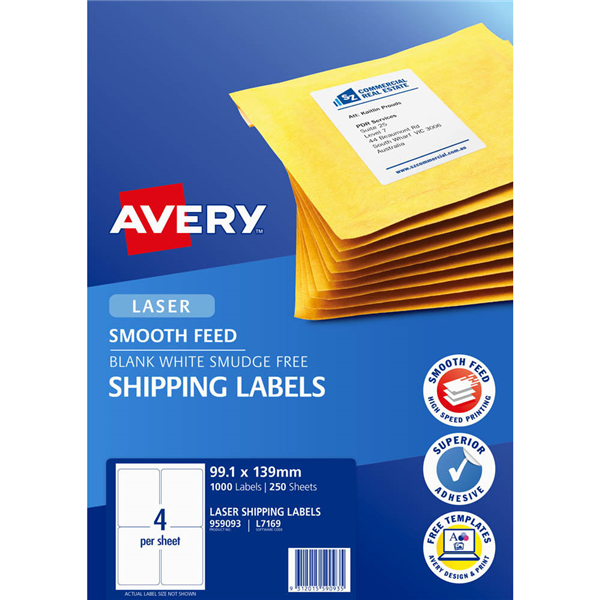 Add your company logo and recipient details to the label using Avery FREE and easy-to-use Design & Print online software. The software also supports mail merge, serial numbers and QR / barcodes for all of your logistical needs Add your company logo and recipient details to the label using Avery FREE and easy-to-use Design & Print online software. The software also supports mail merge, serial numbers and QR / barcodes for all of your logistical needs These shipping labels are made with paper from well-managed forests and have special smooth feed edges with strong adhesive that withstands the high heat of laser printers. So together with the Jam-Free reliability means you can expect flawless printing, even in high speed printers and copiers Trueblock labels feature an opaque silver backing which completely covers up and blocks out existing labels or previous information on parcels or boxes Jam-Free reliability for trouble free printing, saving time and minimising wastage Customise your labels with our free and easy-to-use template software Avery Design and Print - available at averyproducts.com.au/print Ideal for shipping parcels, packages and large gifts Labels made with paper from sourced from sustainable forests