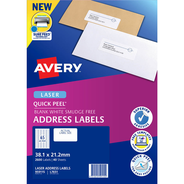 AVERY 959115 L7651 QUICK PEEL ADDRESS LABEL WITH SURE FEED LASER 65UP WHITE PACK 40