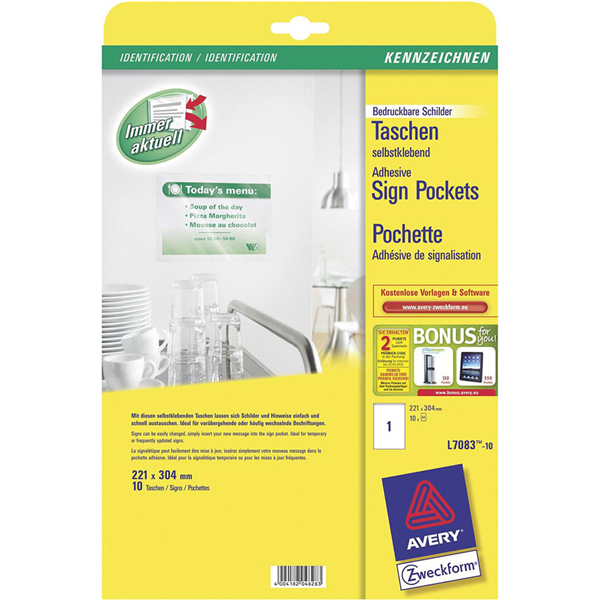 Now you don't have to keep buying new signs every time you want to change your store opening hours or cafe menu Simply change the sheet inside your adhesive pocket Use our free software at averyproducts.com.au, design, print and insert into your pocket Its quick and easy to create professional-looking signs yourself! Ideal for temporary or frequently updated signs Self-adhesive - easy to mount Signs are easily changed without having to replace the entire sign pocket, simply change the A4 paper insert Supported by free Avery software and templates available at averyproducts.com.au/print