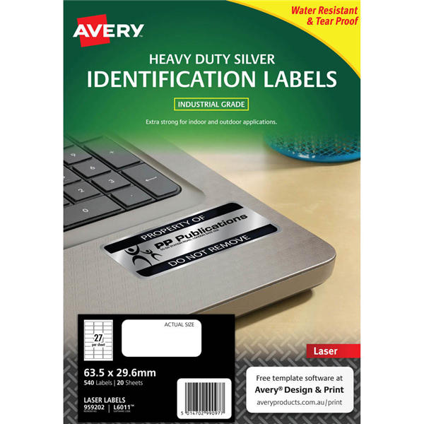 AVERY 959202 L6011 HEAVY DUTY LASER LABELS 27UP SILVER PACK 20