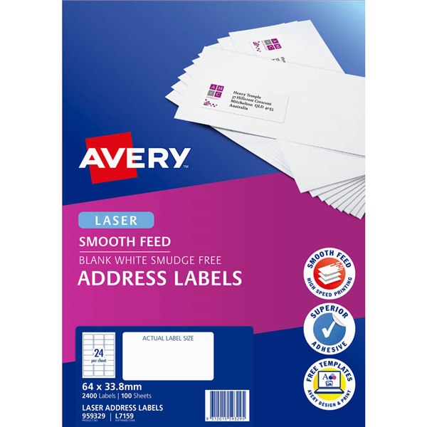 AVERY 959329 L7159 ADDRESS LABEL SMOOTH FEED LASER 24UP WHITE PACK 100