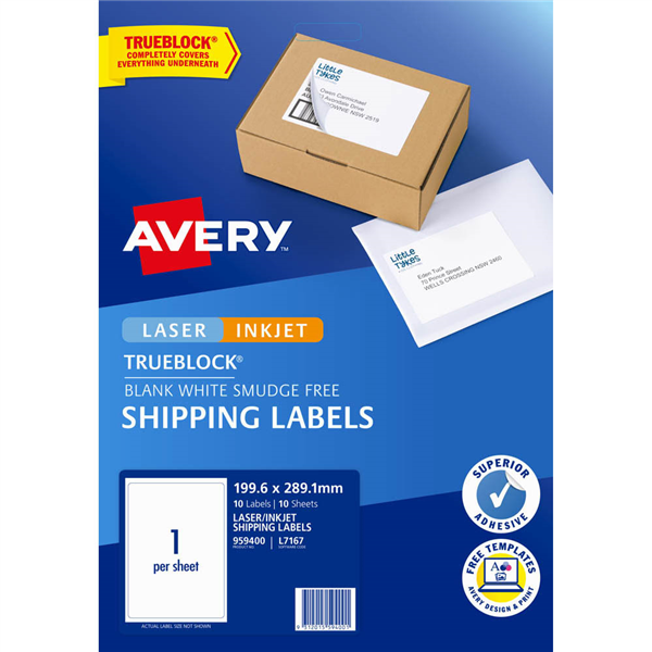 The opaque label covers everything underneath, allowing you to re-use boxes and cartons You can use Avery software to add your company details and recipient details to your labels, creating professional parcels every time TrueBlock technology completely covers everything underneath Ideal for labelling large packages and boxes Design your labels using free Avery software available at averyproducts.com.au Works well with Australia Post, PayPal, eBay and other popular shipping software Labels made with paper from sourced from sustainable forests