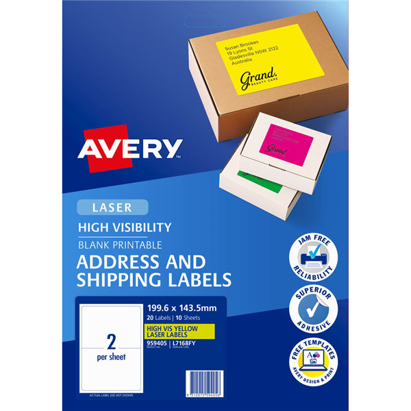 Use Avery Fluoro Labels to make something really stand out These fluoro yellow labels can be printed with your own message so they are great for labelling parcels and other important mail Simply use free Avery software to design and print your labels in minutes Fluoro coloured labels make your items highly visible and enable instant recognition Ideal for marking parcels that need special attention and for labelling pallets in the warehouse stored at high levels Labels can be printed with your own custom message using Avery design software Guaranteed jam free printing on laser printers