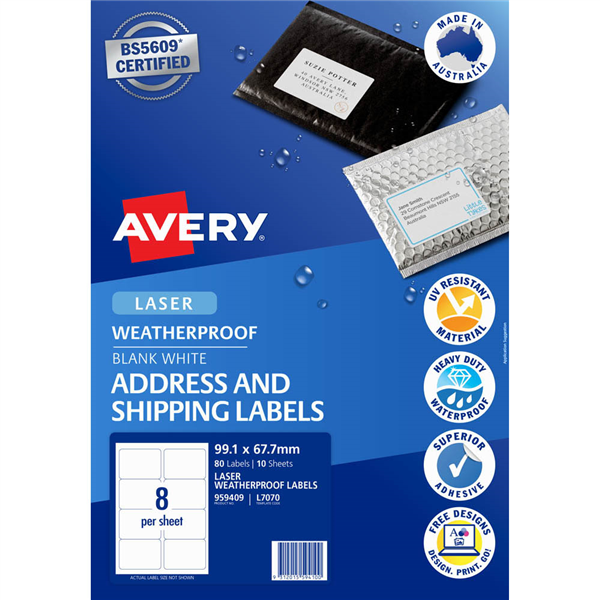 They stand up to tough weather and temperature conditions and resist scuffs, tears and smudges so they remain easy to read Each label can be customised with your logo and recipient details using Avery Design Print Online Now you can send professional-looking packages, every time Durable, water-resistant labels provide strong protection against harsh elements Perfect for shipping, addressing, priority messages, warning labels and more UV-resistant, water-resistant and weatherproof Jam-free and smudge-free guaranteed Supported by free Avery software and templates available at averyproducts.com.au/print