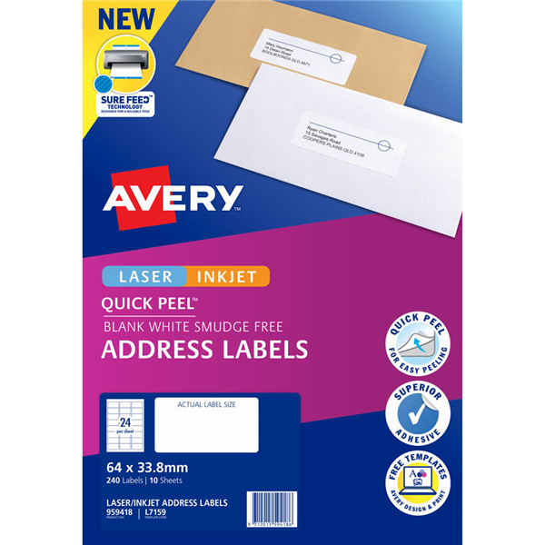 Quick Peel technology allows for quicker and easier detachment of labels from backing sheet Customise your labels with our free and easy-to-use template software; Avery Design and Print - available at averyproducts.com.au/print Special adhesive withstands the high heat of laser printers Labels made with paper from sourced from sustainable forests