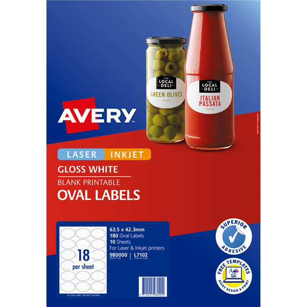 The print-to-the-edge capability lets you apply bold colours and sharp clear text all the way to the edge of the label to vividly market your brand Backed with permanent adhesive, the labels stick to glass, plastic, paper and more, allowing you to put your brand on nearly any product With free templates in Avery Design and Print Online, you can easily customise the labels with your branding Get your products noticed today with these premium labels! Ideal for creating high quality branded labels for your products Permanent adhesive works on glass, plastic and paper, so it can be used on a variety of product packaging Print-to-the-edge feature lets you create a custom look to showcase your product, logo or company Print labels for your product in the quantity you need, when you need them Customise your labels with free Avery designs in Avery Design and Print Online 180 labels per pack