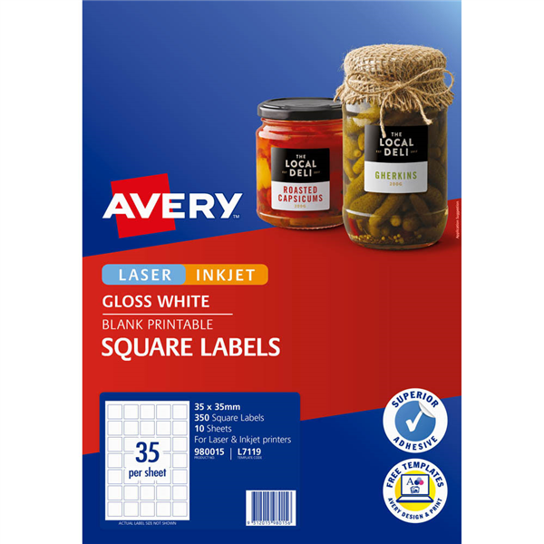 AVERY 980015 L7119 BLANK PRINTABLE LABELS SQUARE LASER/INKJET 35UP GLOSS WHITE PACK 10