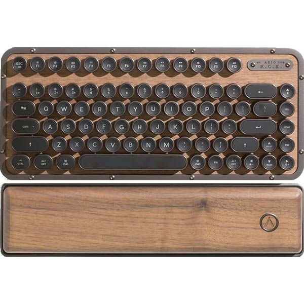 This centerpiece keyboard is comprised of premium materials, a timeless appearance, and intuitive usability With its compact form, the RCK is the ideal creative tool designed for both the traveling and stationary lifestyle A Classic Reborn - Inspired by vintage typewriters and crafted with ultramodern features, the Azio Retro Classic Series is the perfect amalgam of past, present, and future Premium Craftsmanship - Designed with a durable aluminum frame and genuine leather, the Retro Compact Keyboard is a beautiful addition to any workspace Tactile, Clicky, Backlit Keys - The Retro Compact Keyboard uses one-of-a-kind center lit mechanical switches for perfectly illuminated keys. The round mechanical keys are tuned to be tactile and 'clicky', reminiscent of the vintage typewriter Dual USB and Bluetooth Interface - Connect via Bluetooth or USB. When USB mode is selected, simply connect the included USB-C cable to the computer and type away PC and Mac Compatible - The Retro Compact Keyboard is built to fully support both Mac and PC interfaces. Each keyboard comes with extra Mac replacement keycaps that can be easily swapped out Long Usage Time - Made to last, the keyboard has a built-in high-capacity 5,000mAh Li-ion rechargeable battery with the capacity of up to 9 months of usage time with backlight off, and up to 2 months with backlight on USB-C Charging Port - Simply plug in your USB-C cable and charge. Unlike older USB ports, it doesn't matter which side of the connector is up or down Matching Palm Rest - The Retro Compact Keyboard comes with a matching palm rest made of the same genuine material - giving your palms the ultimate comfort when typing Please Note: Each Retro Compact Keyboard top surface genuine leather or wood veneer will have a difference in pattern and shade due to the natural character of the material Please understand the unit you are purchasing will be similar to the picture shown in the product gallery but will have slight variations