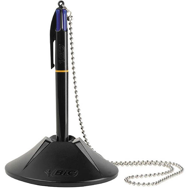 The Bic 4 Colours captive pen has a medium nib which is refillable and is ideal for desks and counters Long lasting as it contains 4 blue inks cartridges Good stability using a weighted base Chain has a 58cm reach capacity Stable weighted base and secure chain Average total writing length of 8,000m Accredited with NF 400 Writing Instruments ecolabel