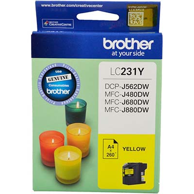 Consistent Quality Printouts - Experience consistently high-quality printouts with no streaking or smudging. Enjoy true-to-life images that can last for decades without fading SPECIFICATIONS Compatible with the following: BROTHER DCPJ562DW, BROTHER MFCJ480DW, BROTHER MFCJ680DW, BROTHER MFCJ880DW 260 Pages (estimated page yield provided based on 5% coverage or at ISO 2471 pattern/normal) Colour: Yellow OEM: LC-231YS UPC: 4977766753005