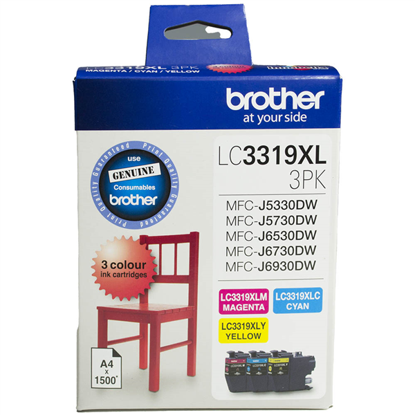 Consistent Quality Printouts - Experience consistently high-quality printouts with no streaking or smudging. Enjoy true-to-life images that can last for decades without fading SPECIFICATIONS Compatible with the following: BROTHER MFC J5330DW, BROTHER MFC J5730DW, BROTHER MFC J6530DW, BROTHER MFC J6730DW, BROTHER MFC J6930DW 1,500 Pages (estimated page yield provided based on 5% coverage or at ISO 2471 pattern/normal) Colour: Value Pack OEM: LC-3319XL3PK UPC: 4977766769525