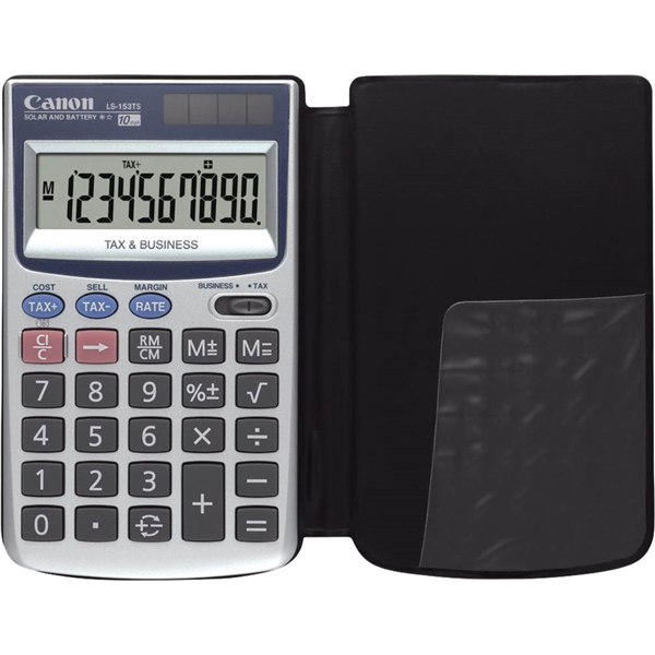 Calculate on-the-go with a pocket calculator - With a stylish metallic design and protective wallet, the Canon LS-153TS 10-digit pocket calculator is perfect for use on-the-go. It features a dual solar and battery power source and a practical cost, sell, margin function All the business functions you need - Small and portable with maximum usability, do tax and business calculations and item counting anywhere Dual power for longevity Save battery and use it for longer with solar and automatic battery back-up for use anywhere, anytime Enjoy large display in pocket size - The angled, crystal display supports 10 digits, making numbers easy to read, minimising glare and improving viewing Protect your numbers with wallet case - Travel in style with assurance that your calculator is well protected from damage with a durable wallet case. Weighing at only 69 grams, you won't even notice it being there Tax calculation Business calculation Memory function Large display Executive finish - metallic silver top coating Large rubber keytops for easy operations Wallet case included