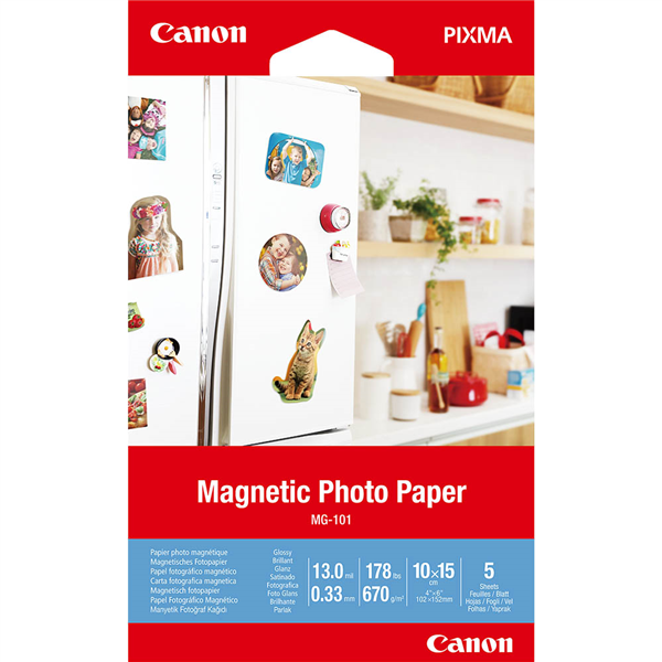 High-quality photo printing on magnetic media Ideal for creative magnetic photo displays Decorate magnetic surfaces without damaging walls Create interactive educational games for children Create picture puzzles, alphabet charts or number series on your fridge to make learning at home more fun and interactive Canon photo papers have a micro-porous coating that quickly absorbs ink deep below the surface to prevent any excess ink from being left on the paper's surface Produce lab quality photos in your own home Using genuine Canon ink and paper you will be assured of outstanding results everytime