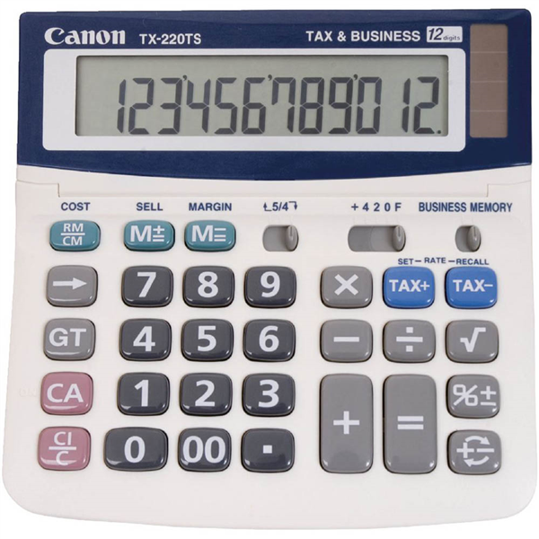 Complete all your business and tax calculations with ease, with a large 12 digit LCD display All the calculator functions you need - Supporting tax and business calculations and item counting, Canon TX-220TS features a decimal point setter, square root, percentage and reverse function Dual powered with solar capability - Get more use out of the Canon TX-220TS with solar and automatic battery back-up for use anywhere, anytime Take advantage of the extra large tilt display screen - With an angled, crystal display supporting 12 digits and minimising glare, numbers are easy to read Tax calculation Business calculation Grand total memory Decimal selection (+420F) Extra large adjustable display