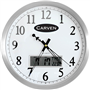 Analog wall clock with date/day. Silver/chrome frame with glass face